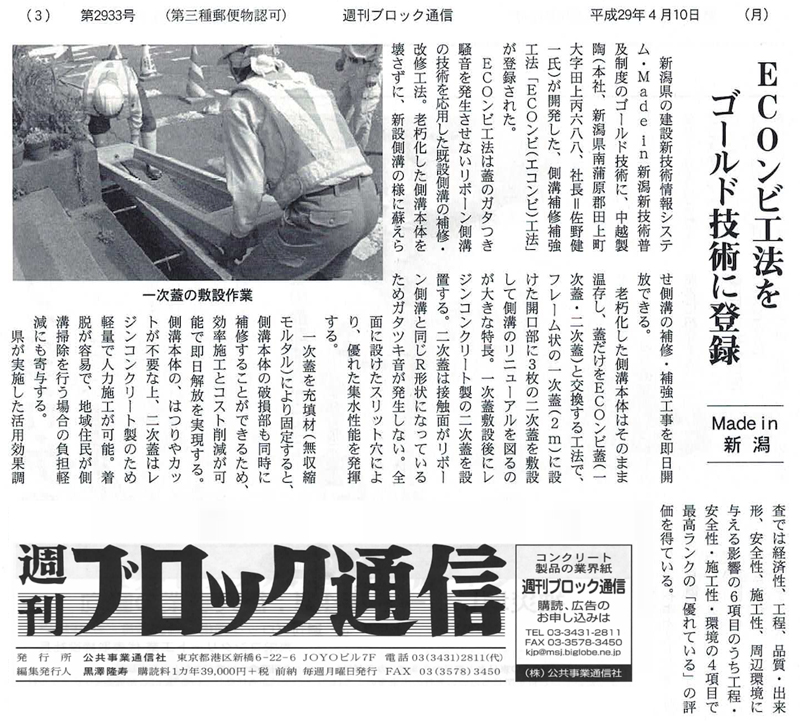週刊ブロック通信の記事(平成29年4月10日)はこちらから - 熊本県新技術・新工法 登録番号16027